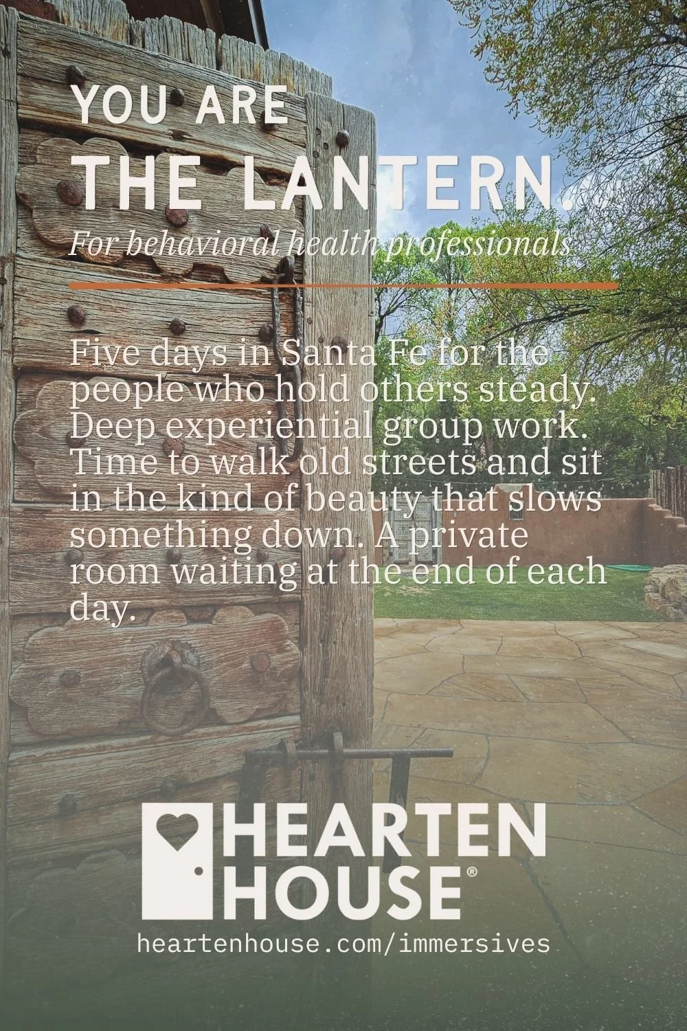 Five days in Santa Fe for the people who hold others steady. Deep experiential group work. Time to walk old streets and sit in the kind of beauty that slows something down. A private room waiting at the end of each day.