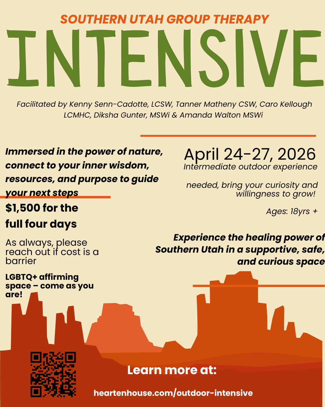May 8-11, 2026. Southern Utah. $1,500, meals included. LGBTQ+ and BIPOC affirming.